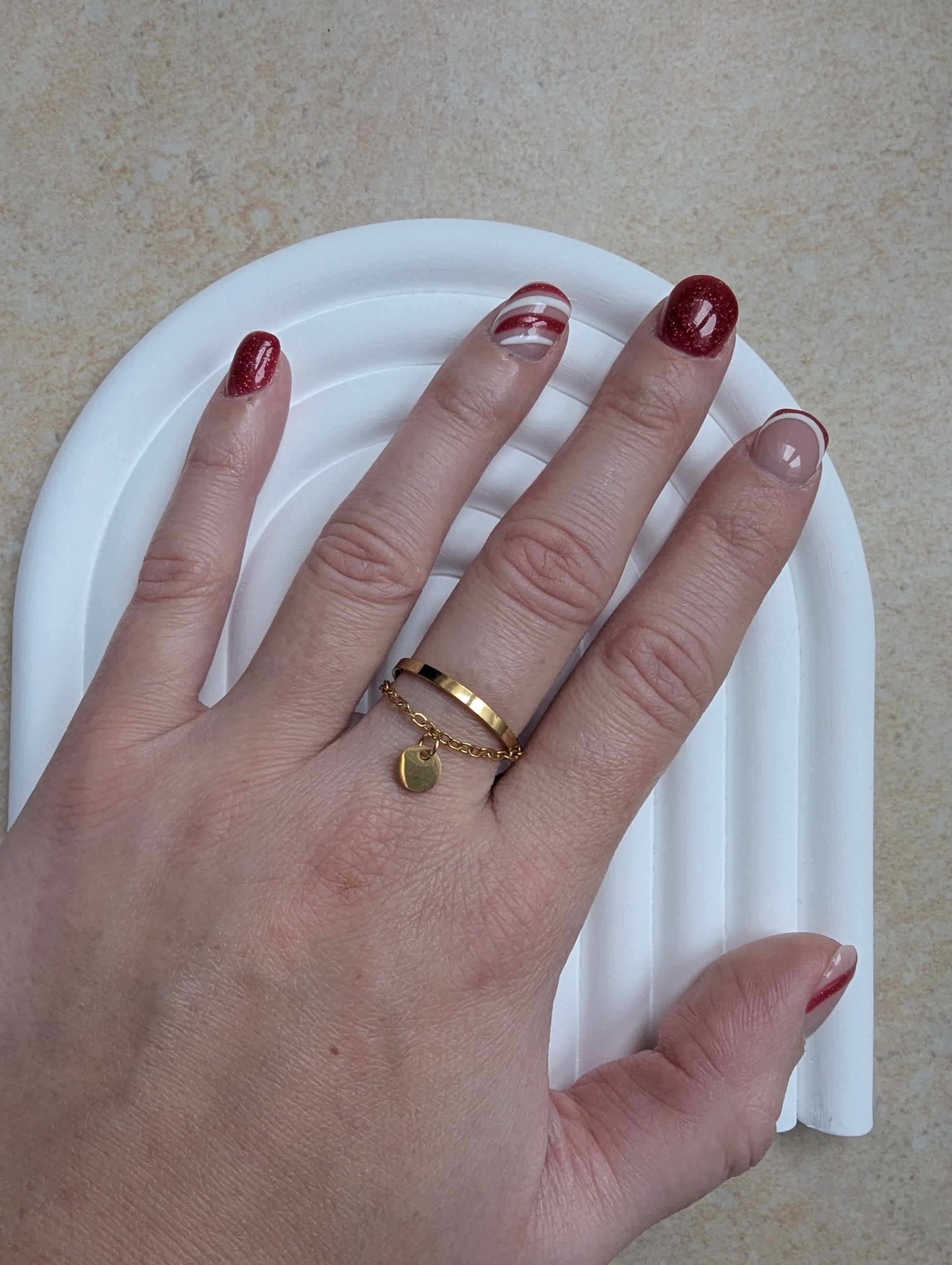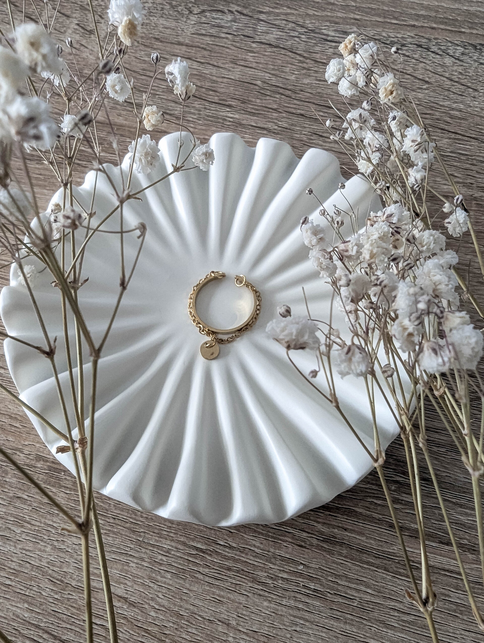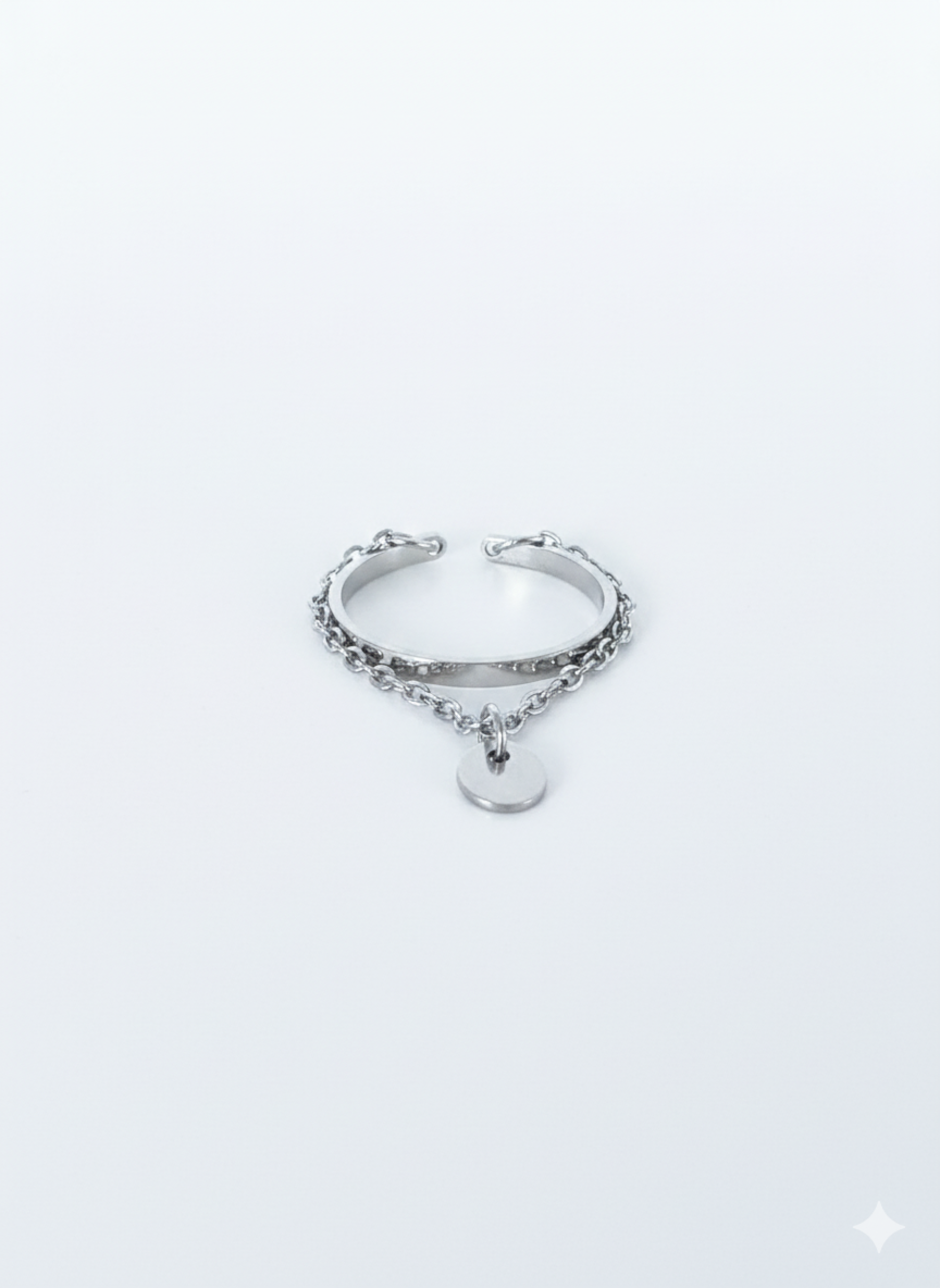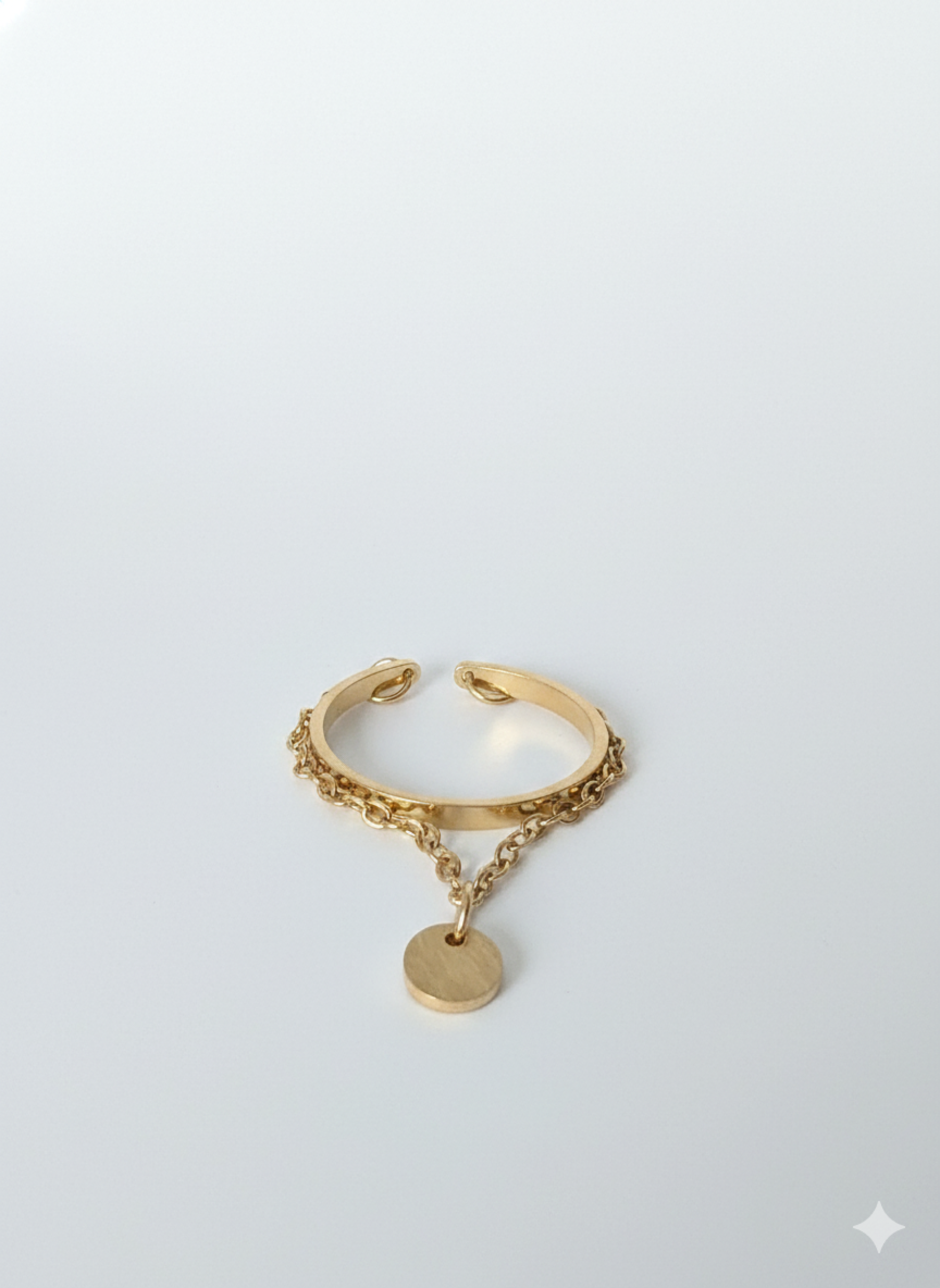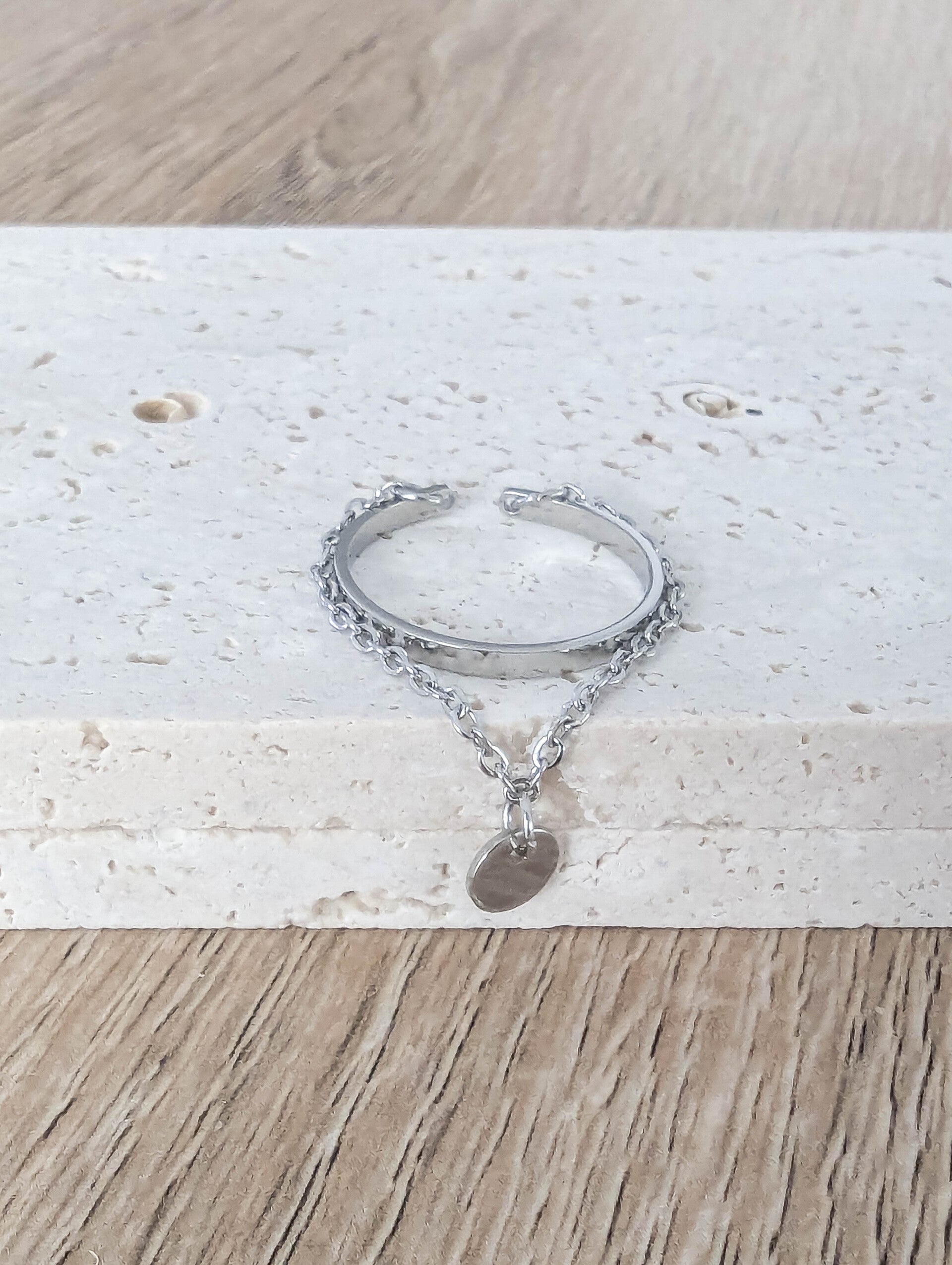 Élégante et contemporaine, la bague « Althéa » se distingue par son design délicatement structuré. Elle combine l'allure d'un anneau ouvert moderne avec une fine chaîne ornée d'un petit médaillon rond, symbole de douceur et d'équilibre.