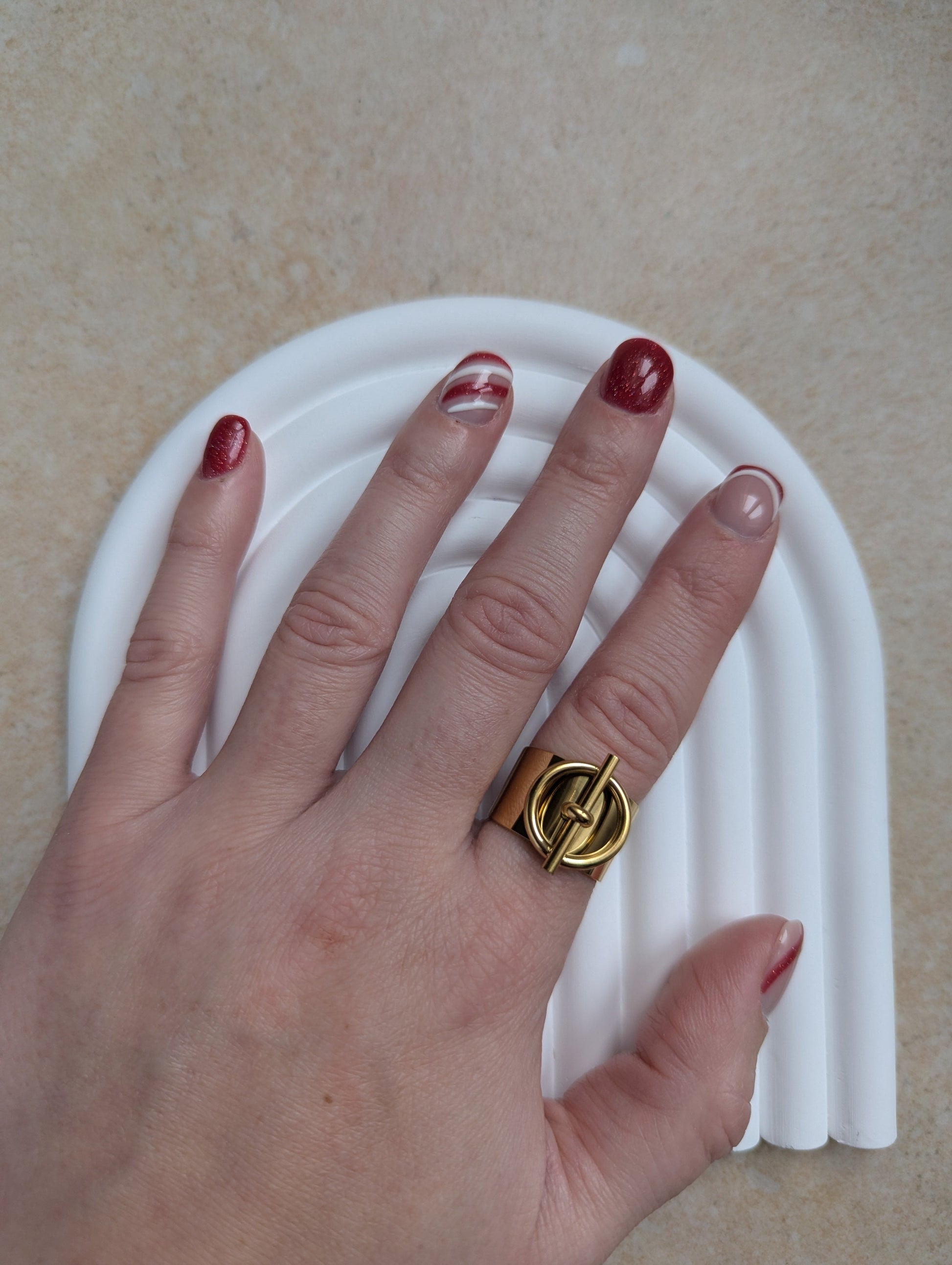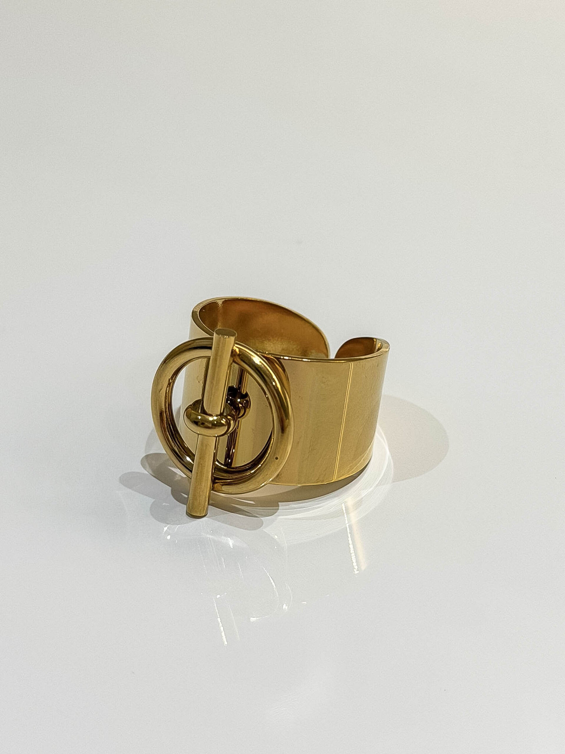 Alliant modernité et élégance, la bague « Axis » se distingue par son design audacieux et structuré. Sa large bande dorée reflète la lumière avec intensité, tandis que le fermoir circulaire stylisé, inspiré des boucles de ceinture, apporte une touche contemporaine et raffinée.