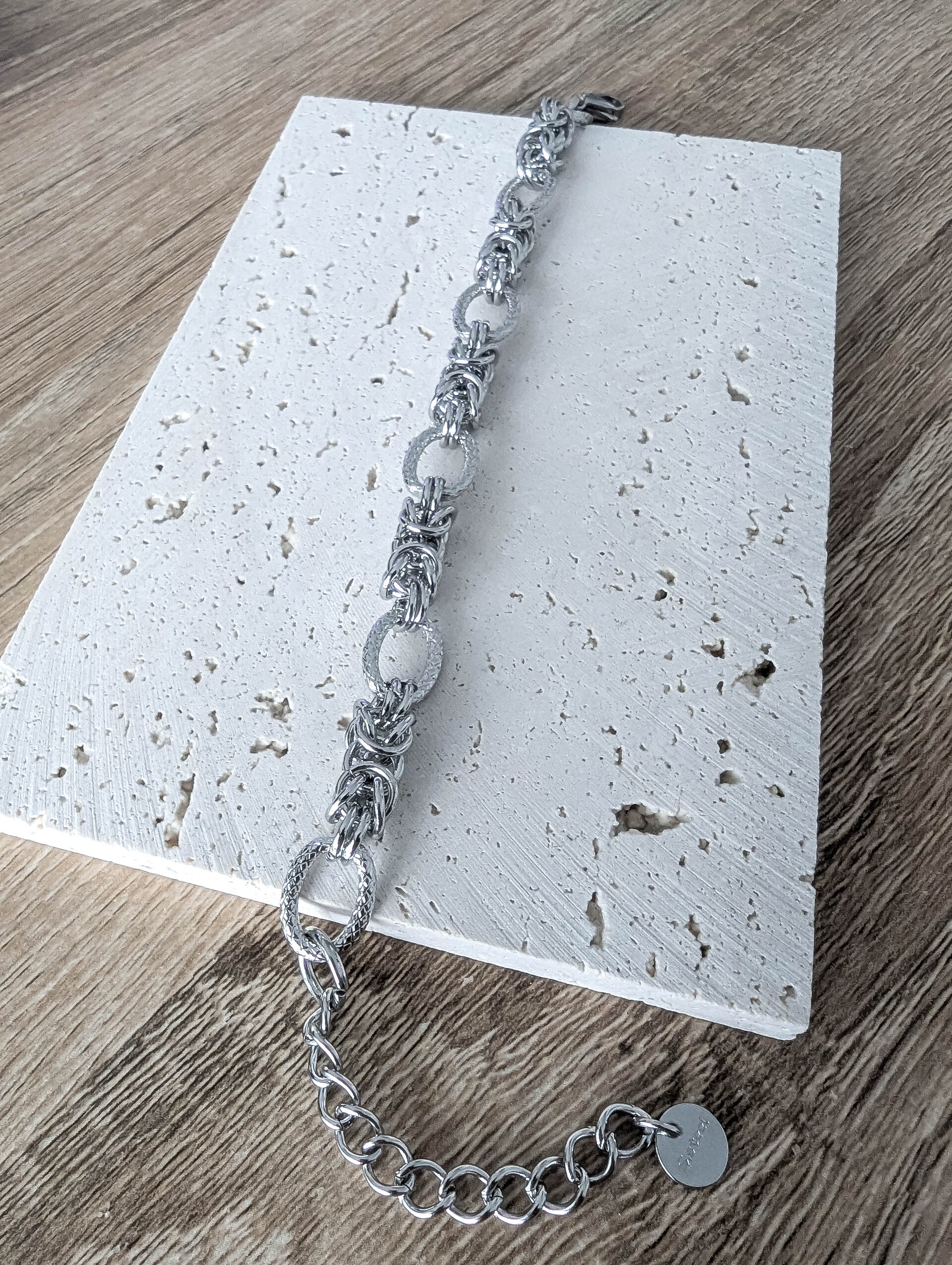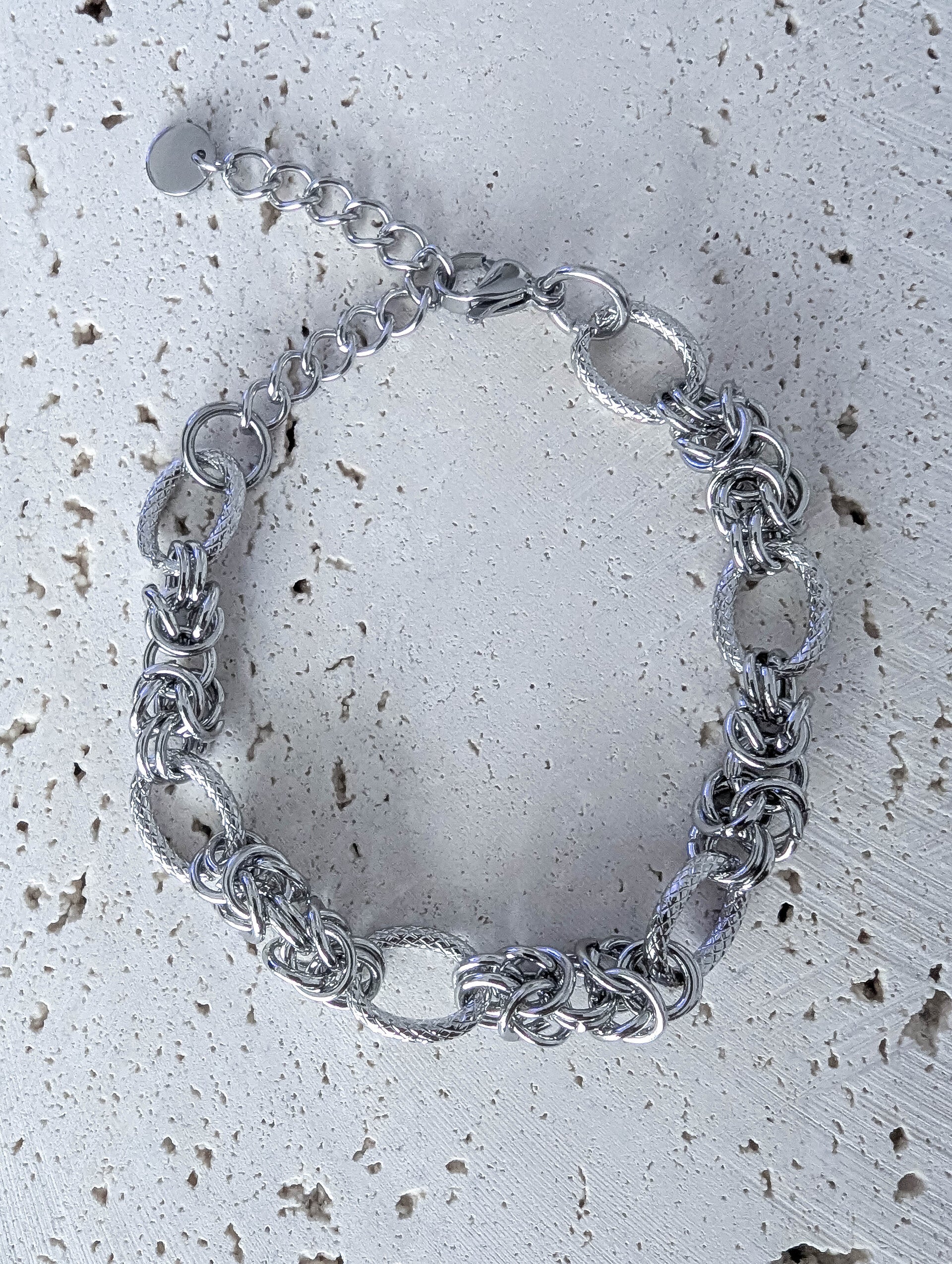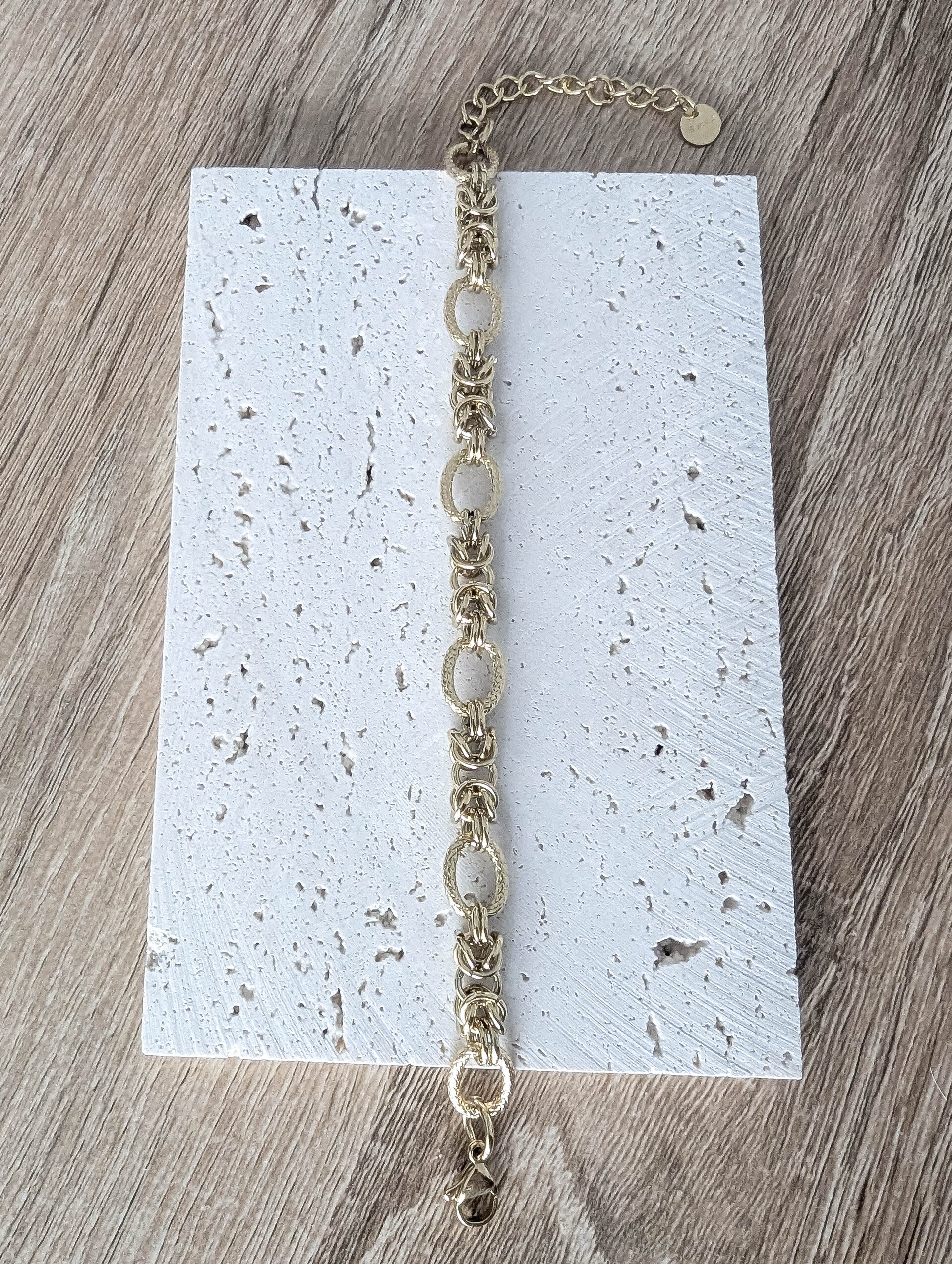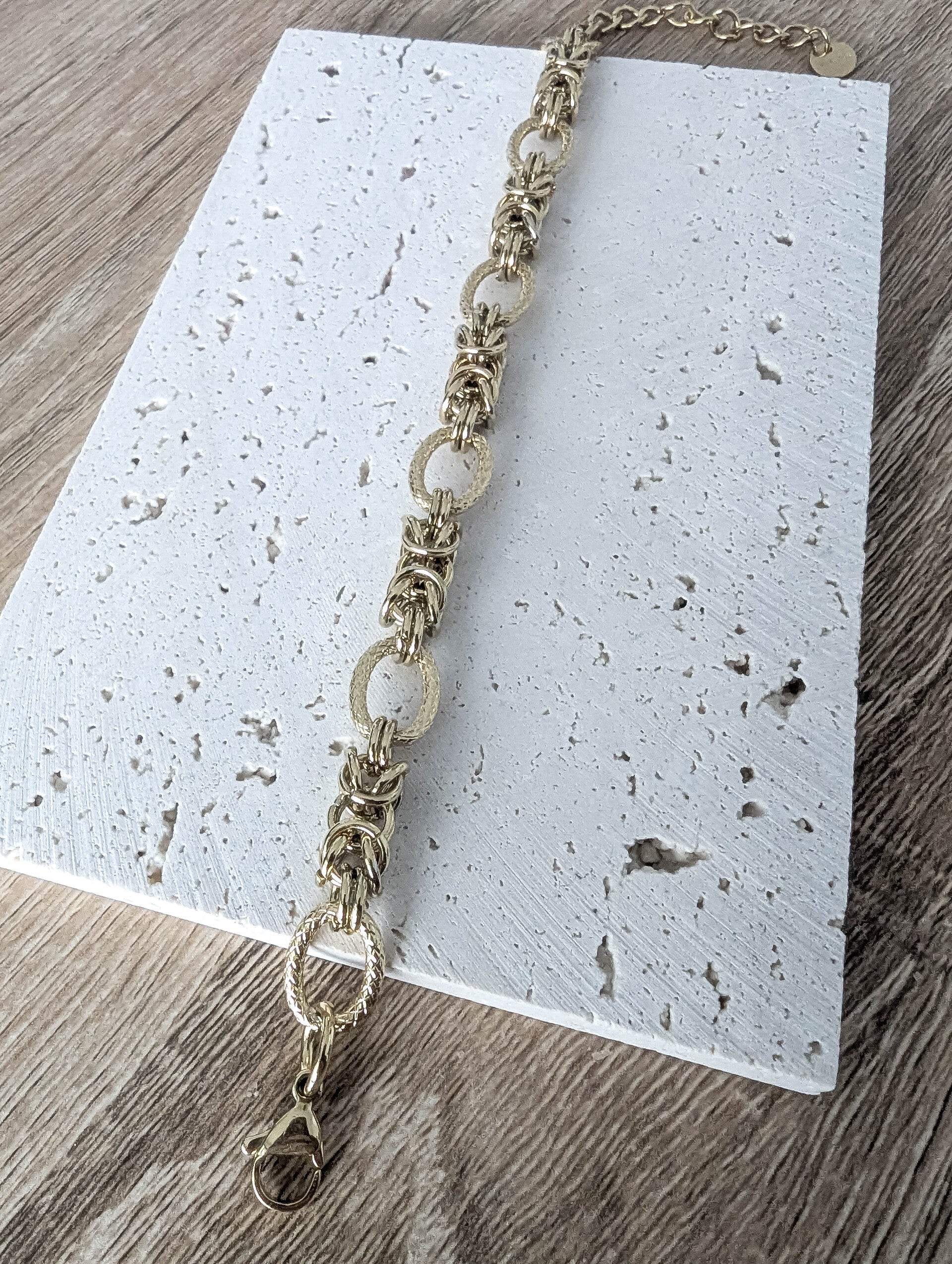 Ses maillons texturés et entrelacés créent un jeu de lumière captivant, tandis que sa finition dorée apporte une touche de raffinement intemporel.