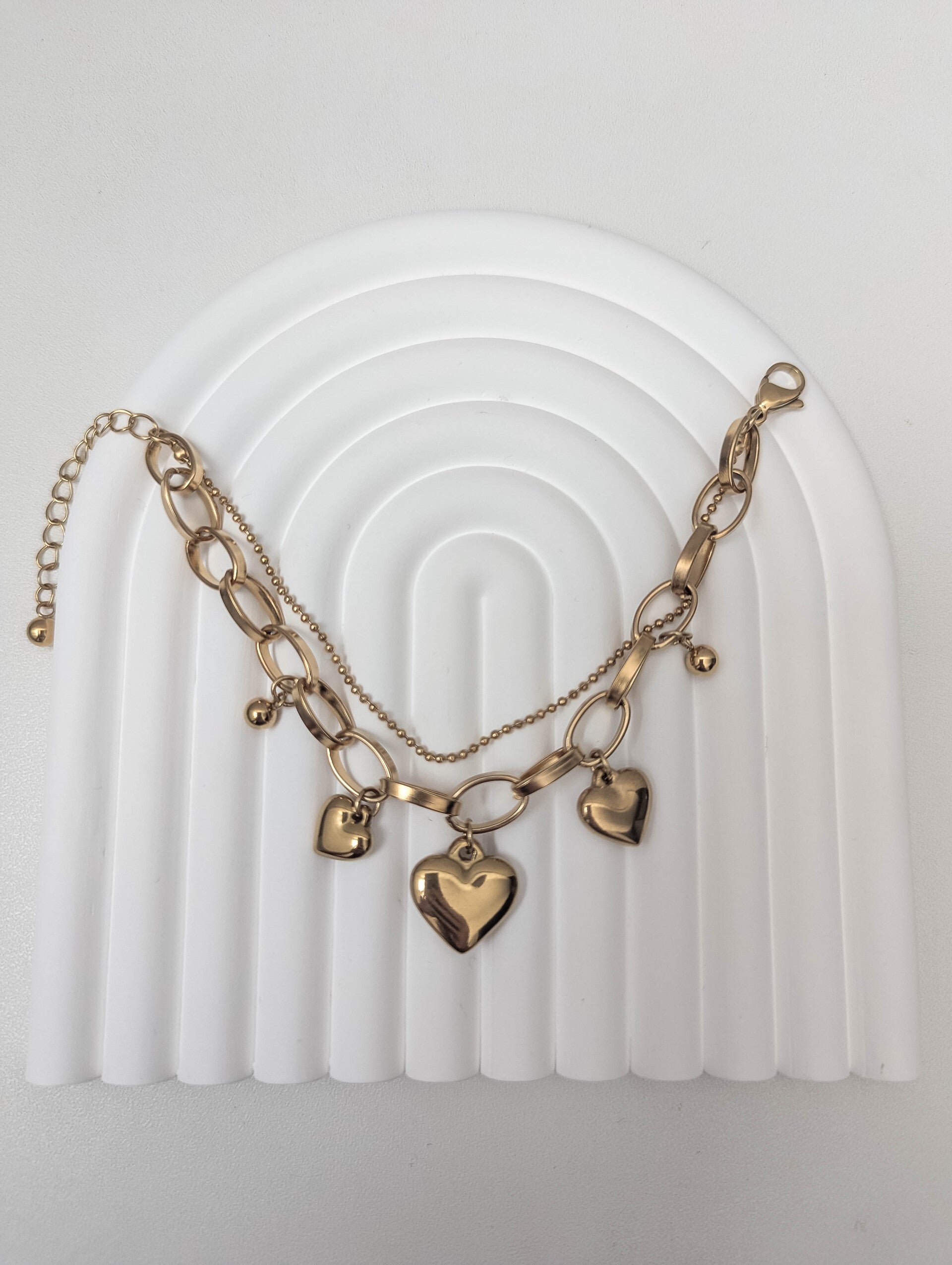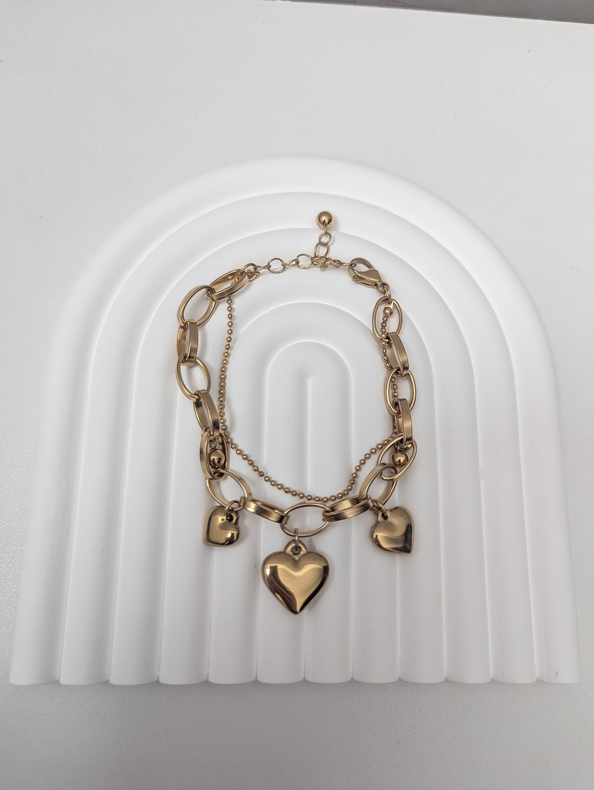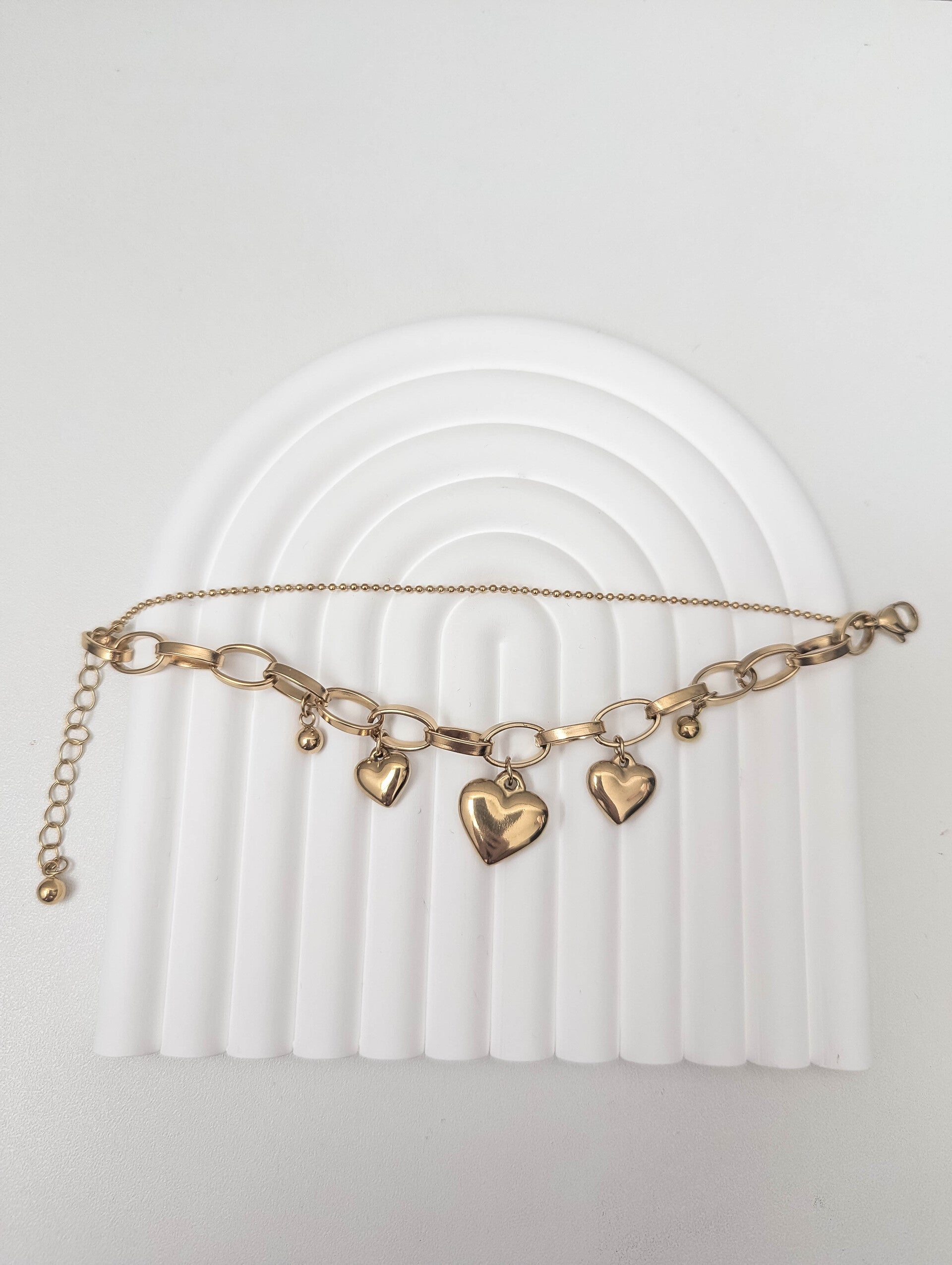 Laissez parler votre éclat avec le bracelet Eléna, une création dorée qui allie douceur et élégance. Composé d’une chaîne à maillons texturés sublimée par de délicates perles dorées, il se distingue par ses trois pendentifs en forme de cœur, symboles intemporels d’amour et de féminité.