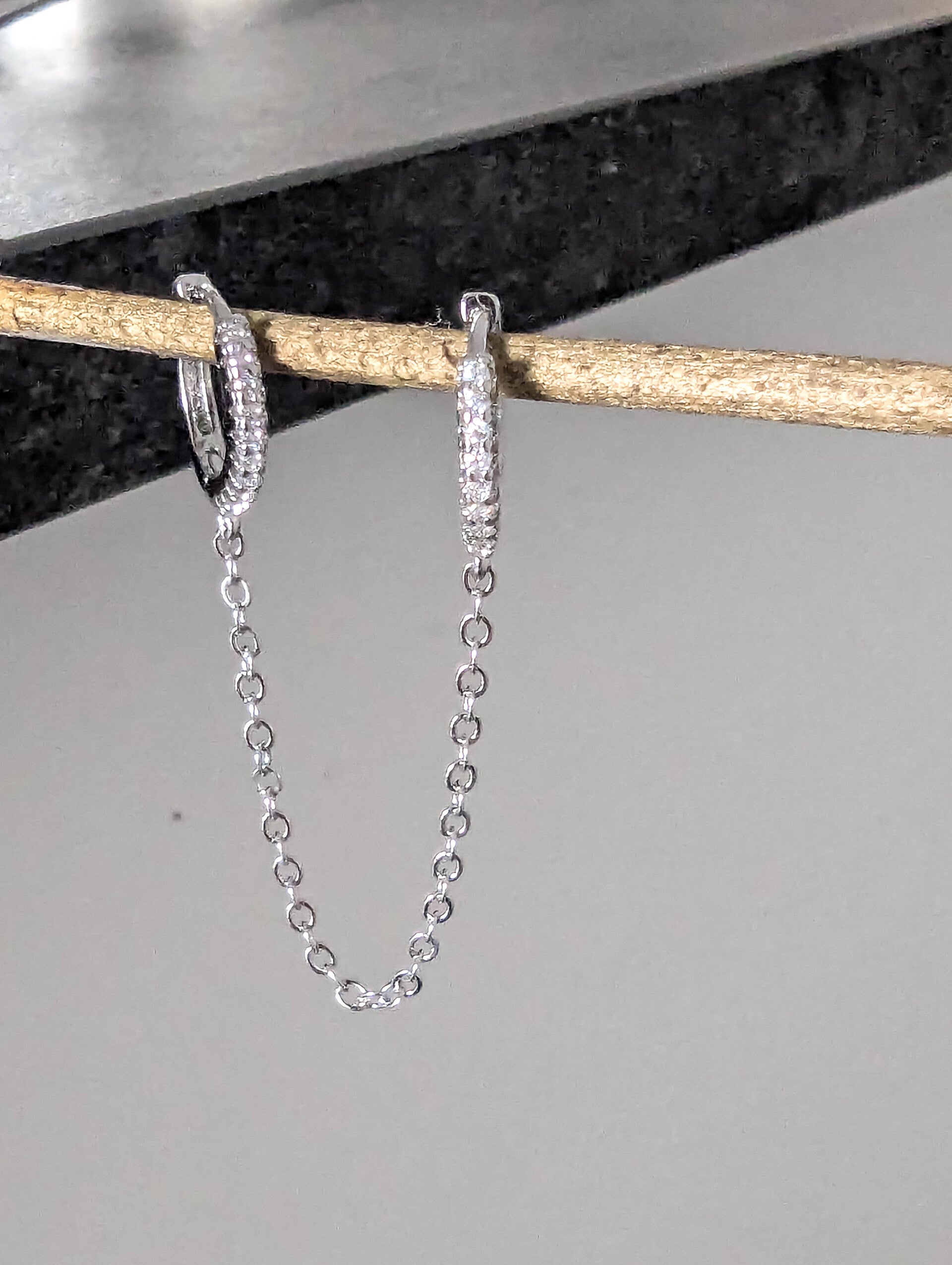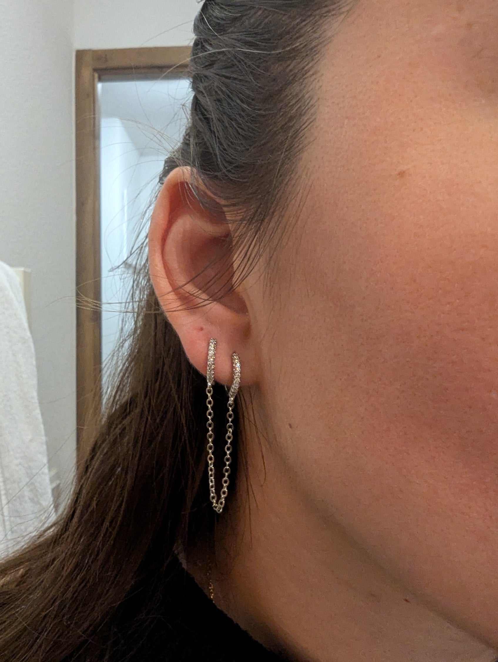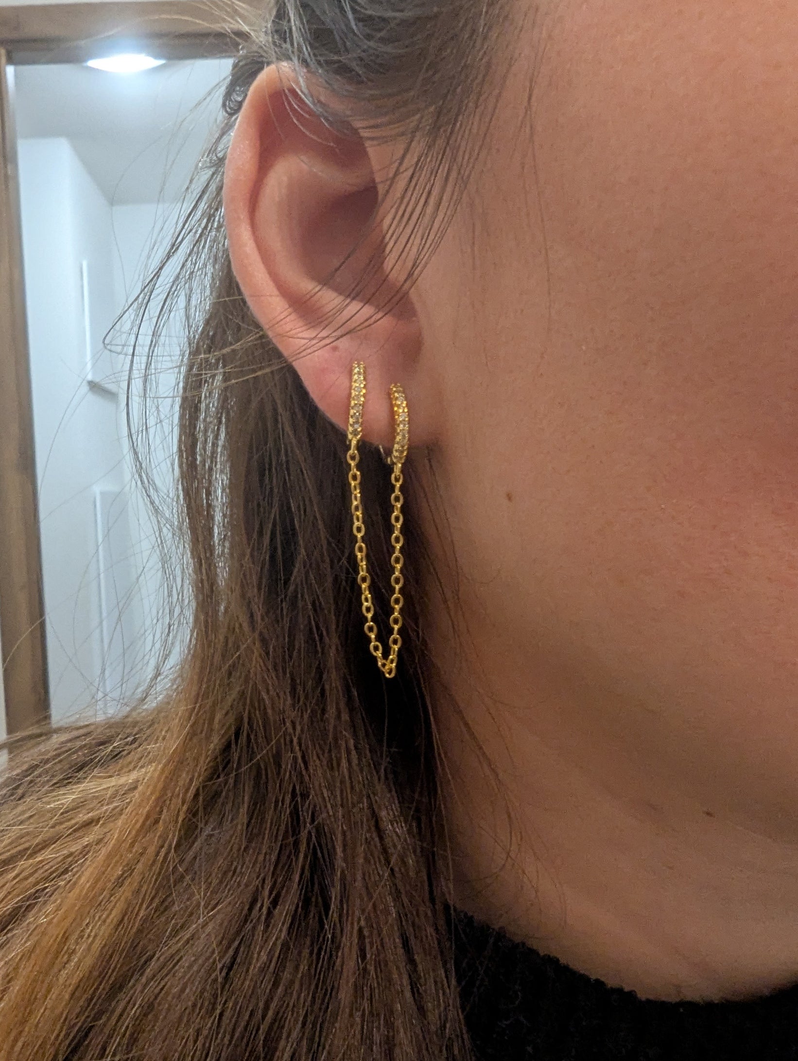 Composée de créoles dorées pavées de zircons étincelants, elles sont reliées par une fine chaîne dorée, créant un jeu de mouvement élégant et raffiné.