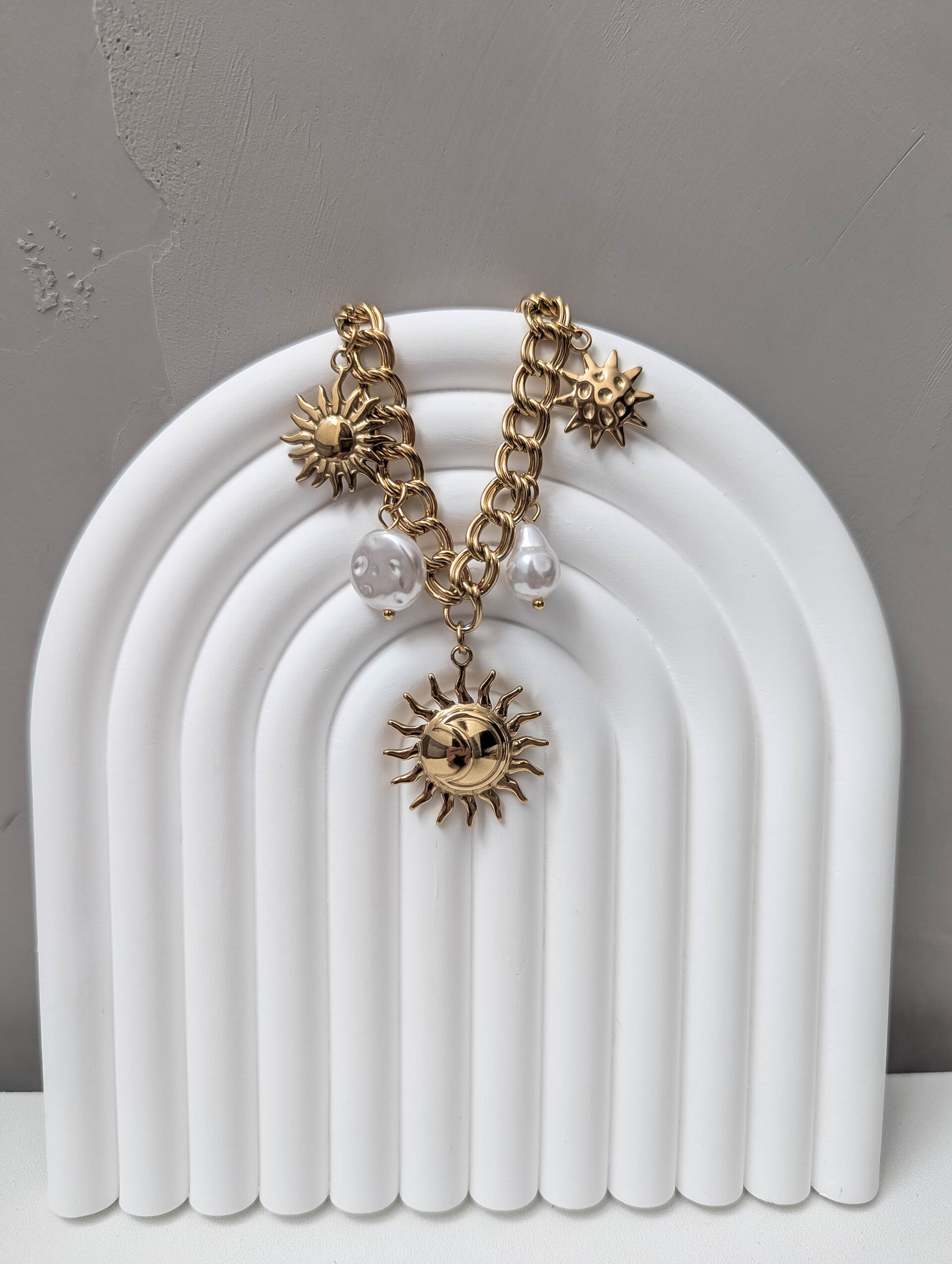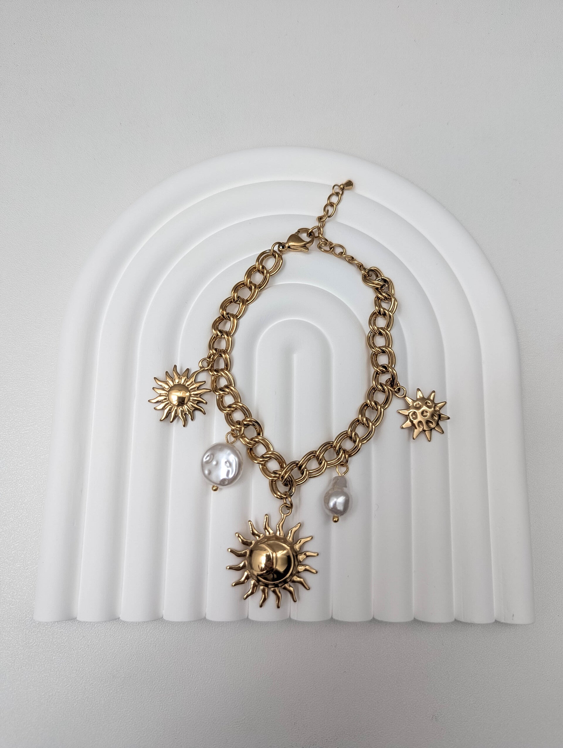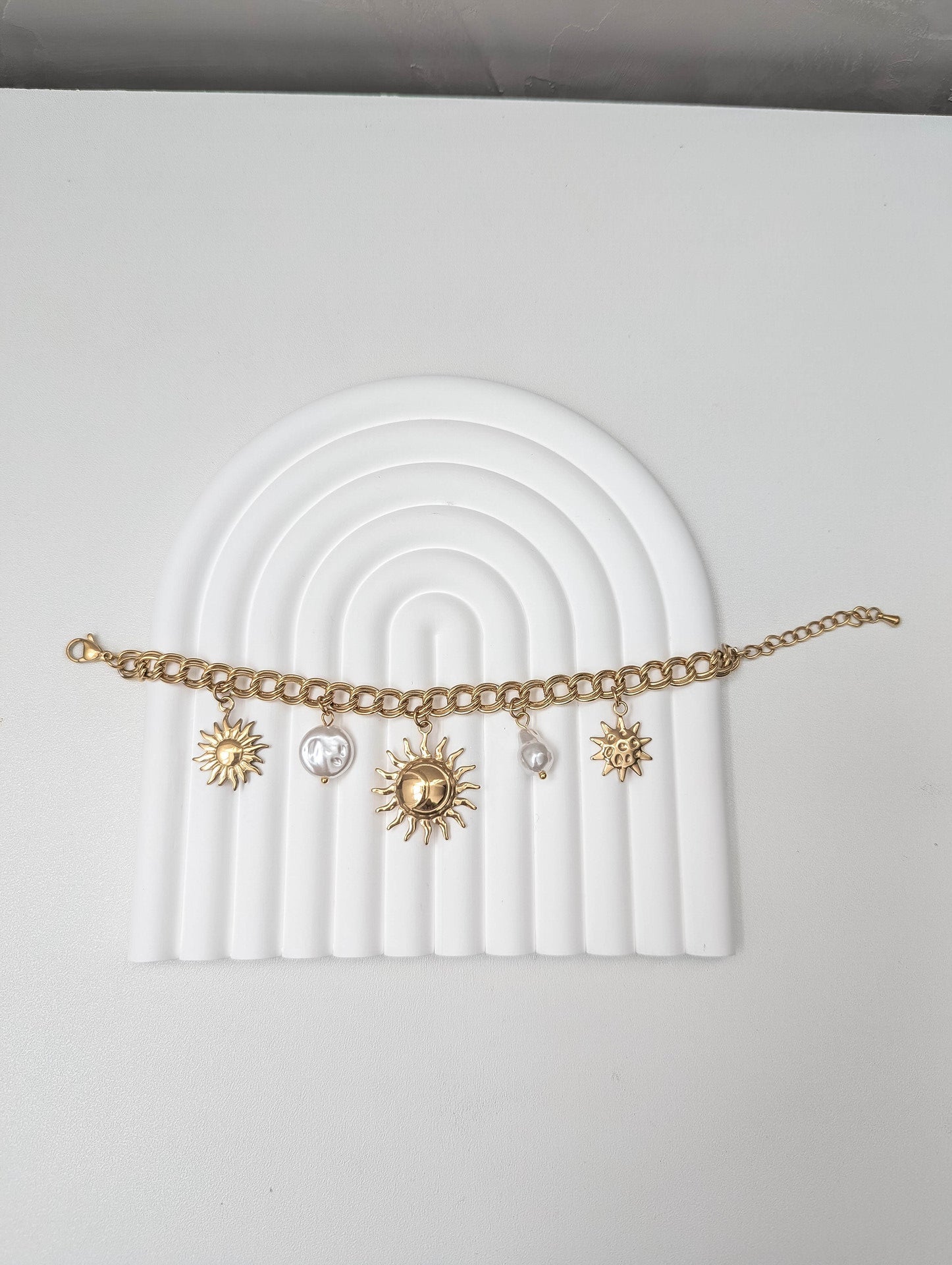 Laissez-vous envoûter par l'éclat solaire du bracelet Eliora, une ode à la lumière et à la féminité rayonnante. Ses pendentifs dorés en forme de soleil et ses perles nacrées évoquent la chaleur du jour et la douceur des nuages, créant une harmonie parfaite entre puissance et délicatesse.