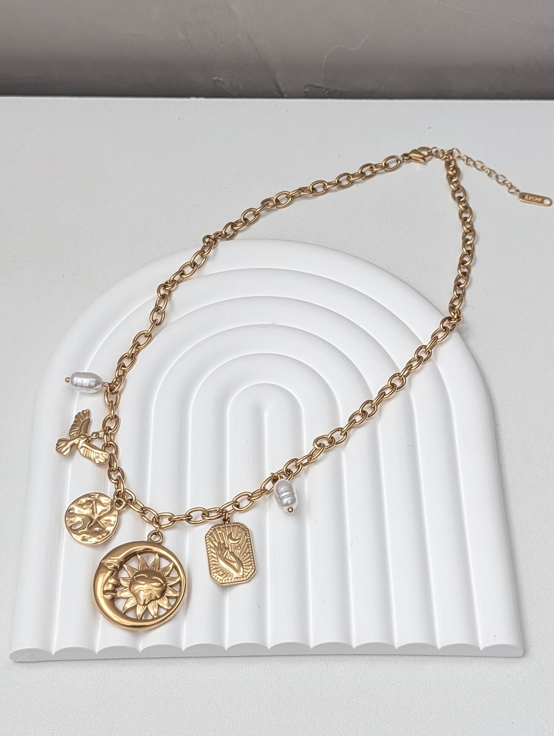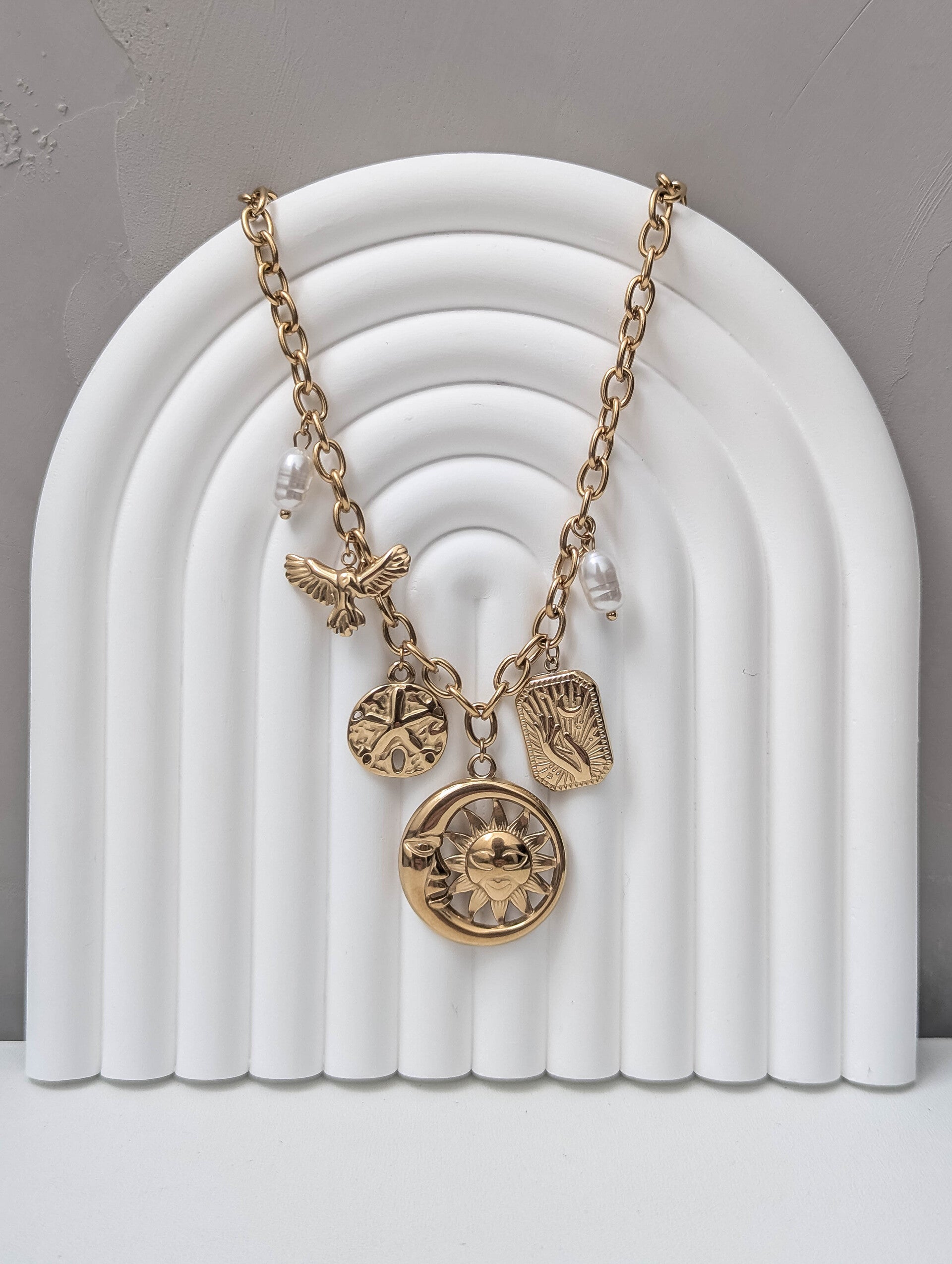 Composé d'une chaîne à maillons dorés et orné de multiples pendentifs symboliques, le soleil rayonnant, la lune protectrice, l'aigle majestueux, et le médaillon gravé. Ce bijou capture l'équilibre entre lumière, liberté et puissance intérieure.