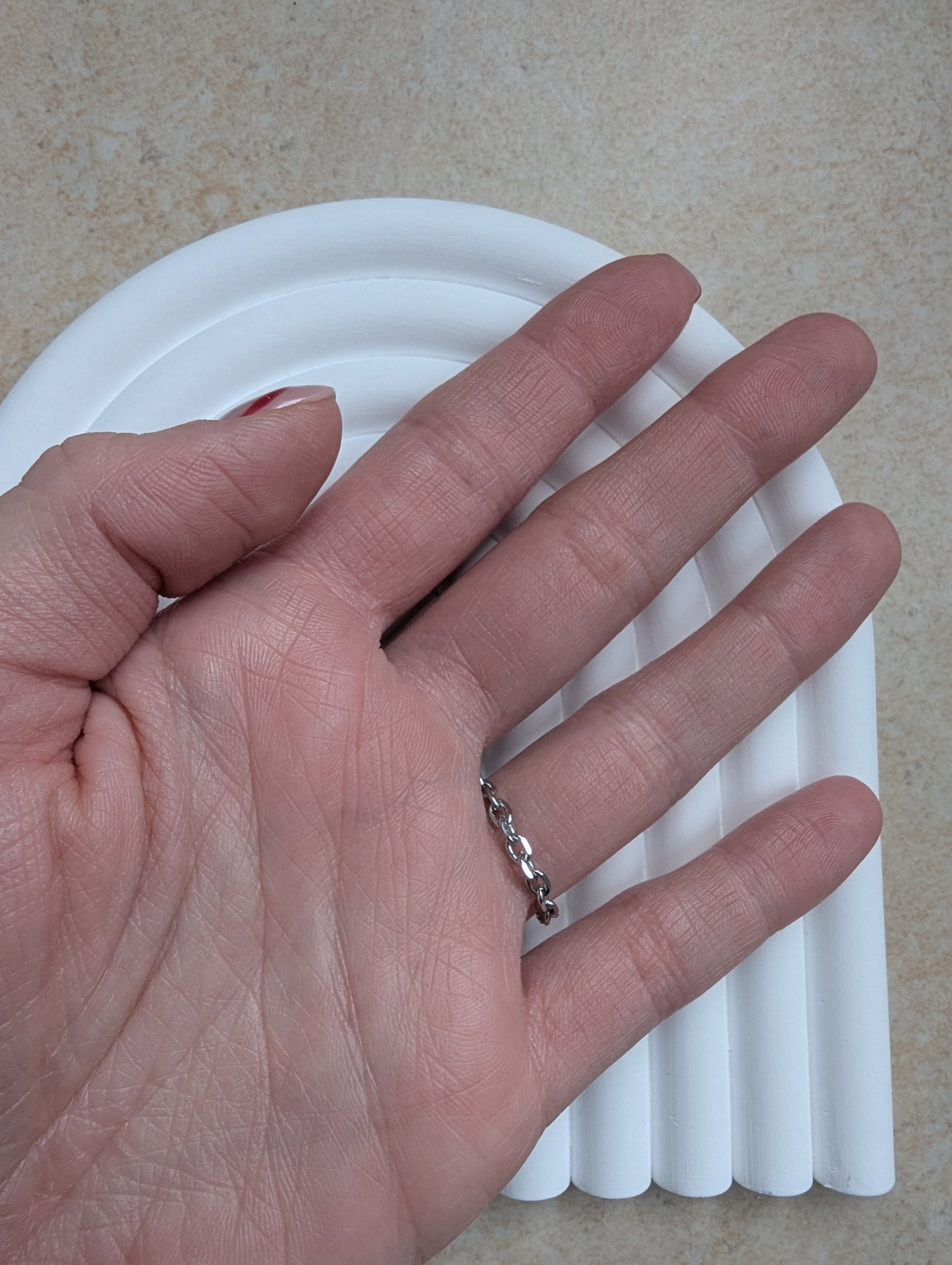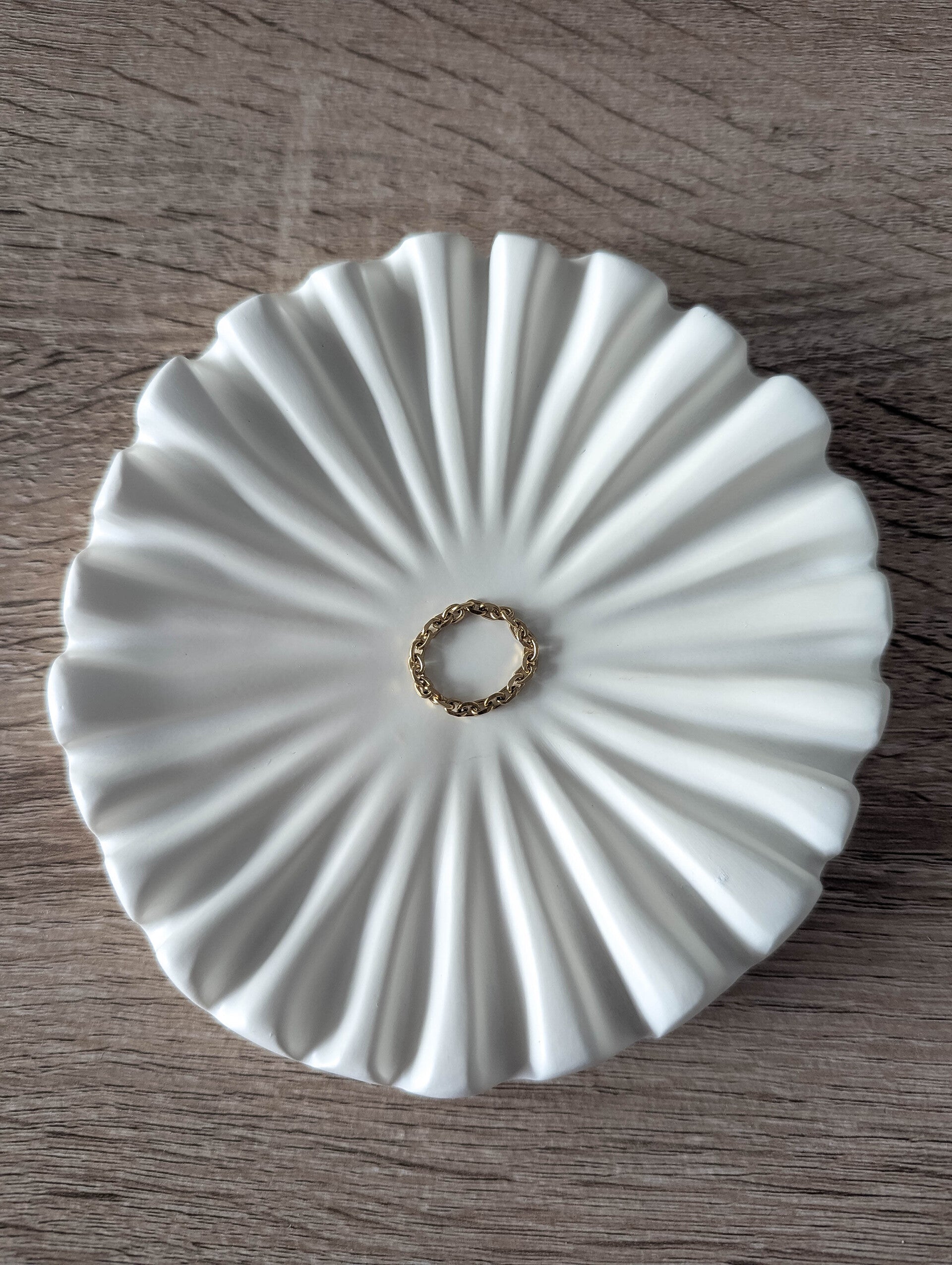 Alliant modernité et audace, la bague « Kaïa » séduit par son design contemporain et son éclat doré. Composée de maillons entrelacés, elle revisite la tendance des bijoux à maillons avec une touche raffinée et minimaliste.