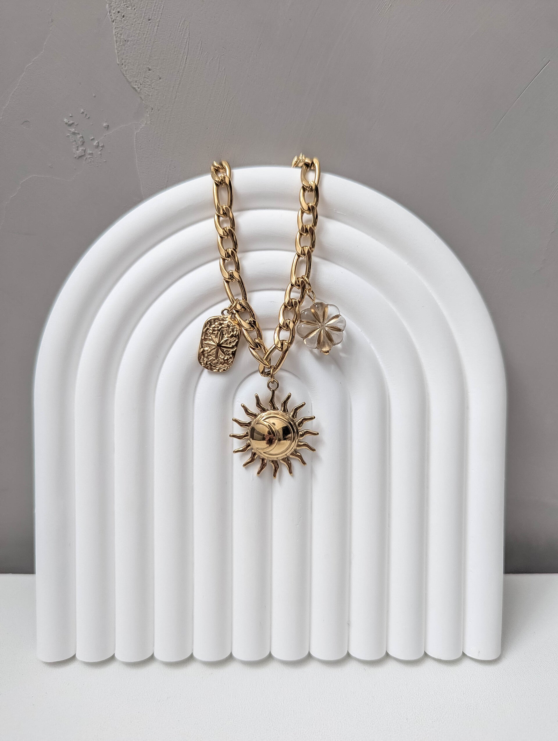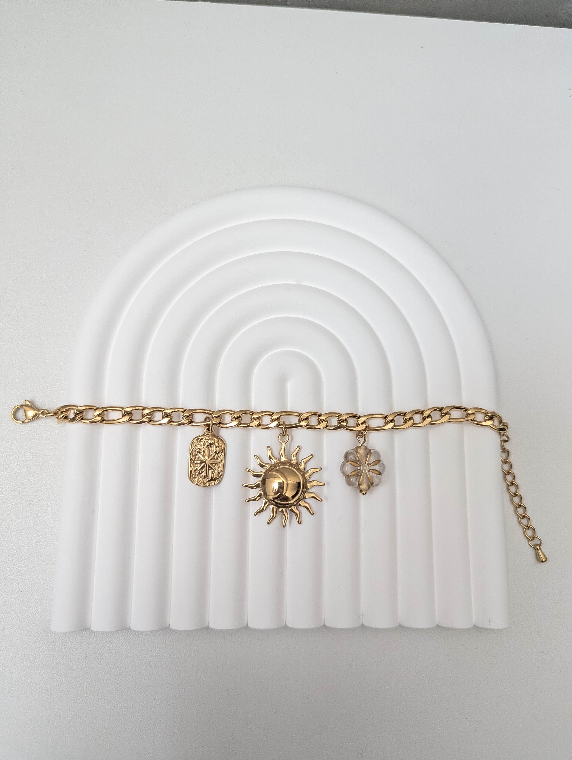 Ce bijou doré à l’or fin se compose d’une chaîne élégante à gros maillons sublimée par trois charms symboliques :