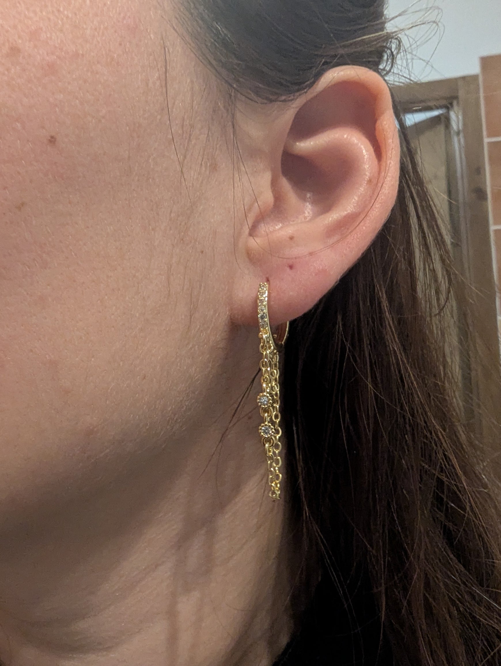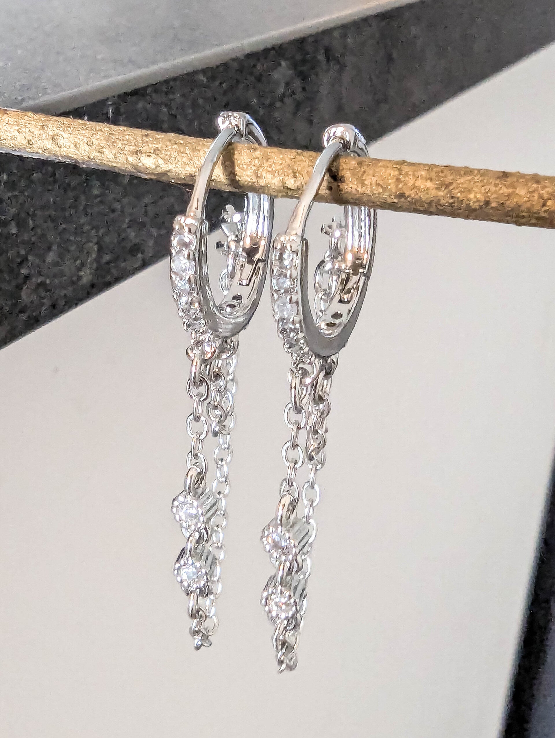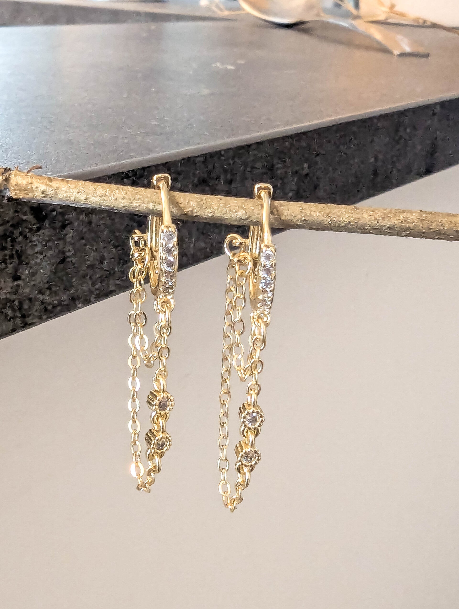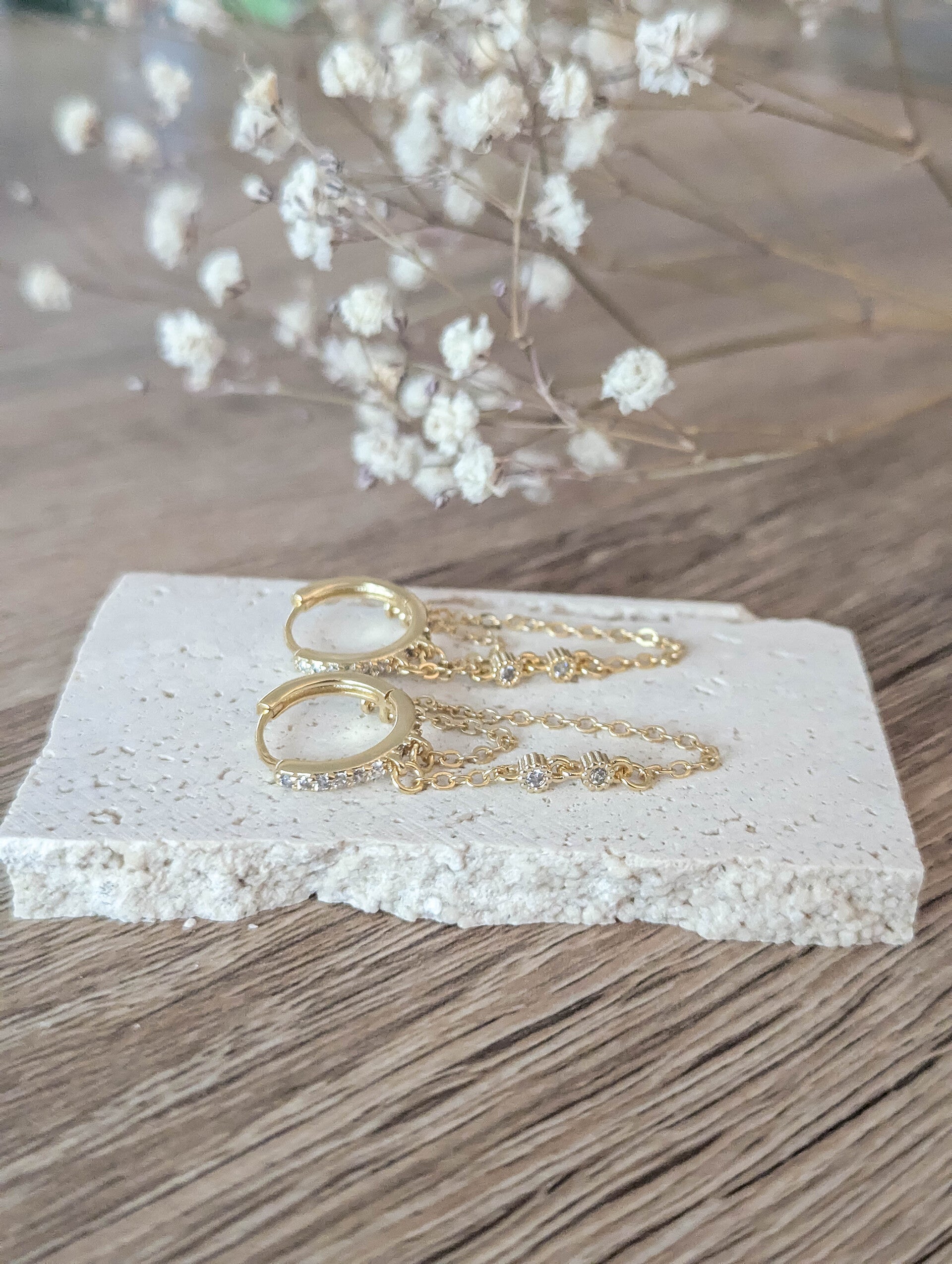 Apportez une touche d'éclat et de raffinement à vos tenues avec ces magnifiques boucles d'oreilles à double chaîne ornées de pampilles scintillantes en cristal. Leur design délicat joue avec la lumière à chaque mouvement, créant un effet à la fois chic et sophistiqué.