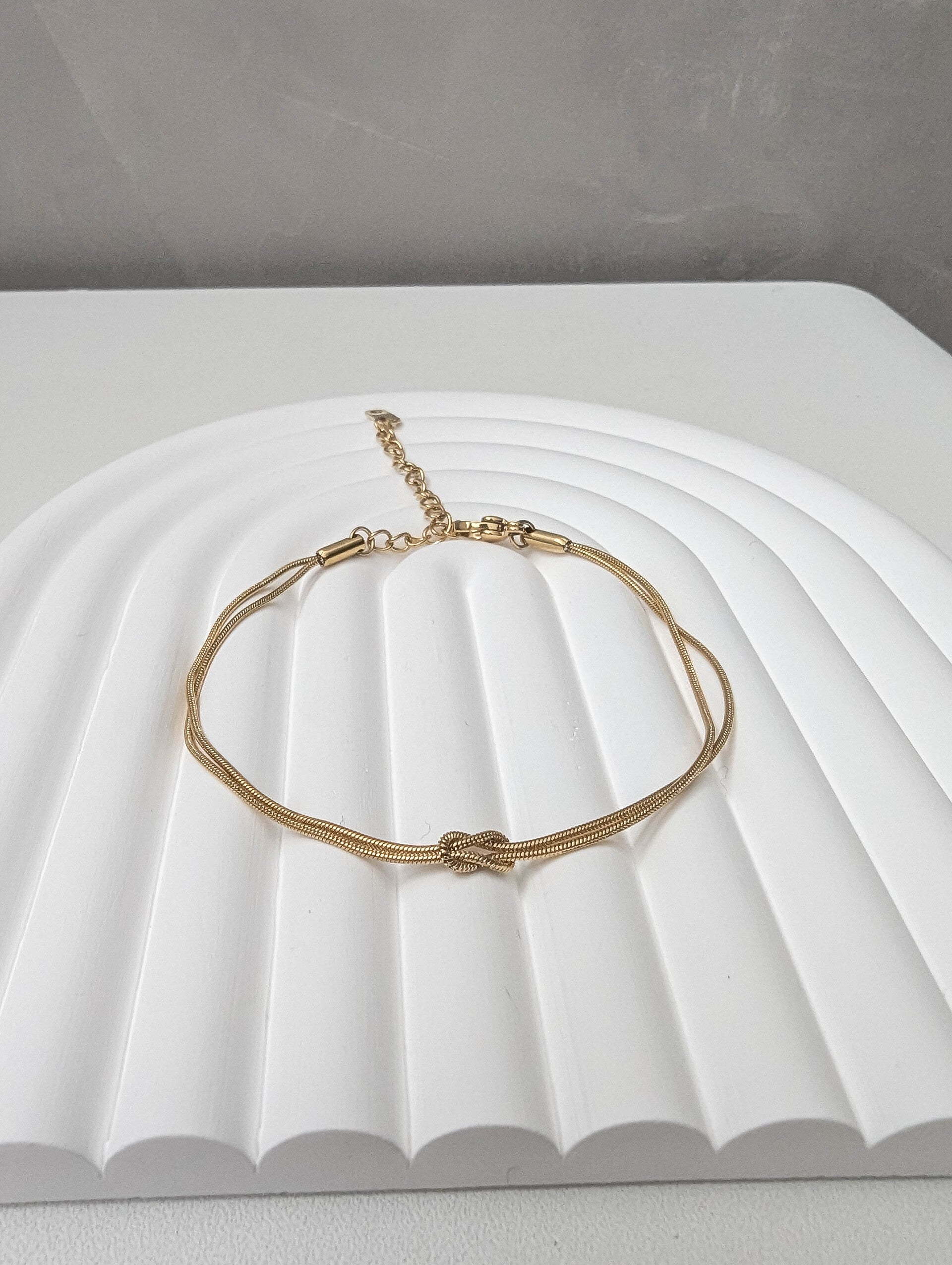 Composé d'une chaîne serpent double en acier inoxydable plaqué or, il se distingue par son nœud central délicatement entrelacé, symbole d'un lien fort et d'une union éternelle.