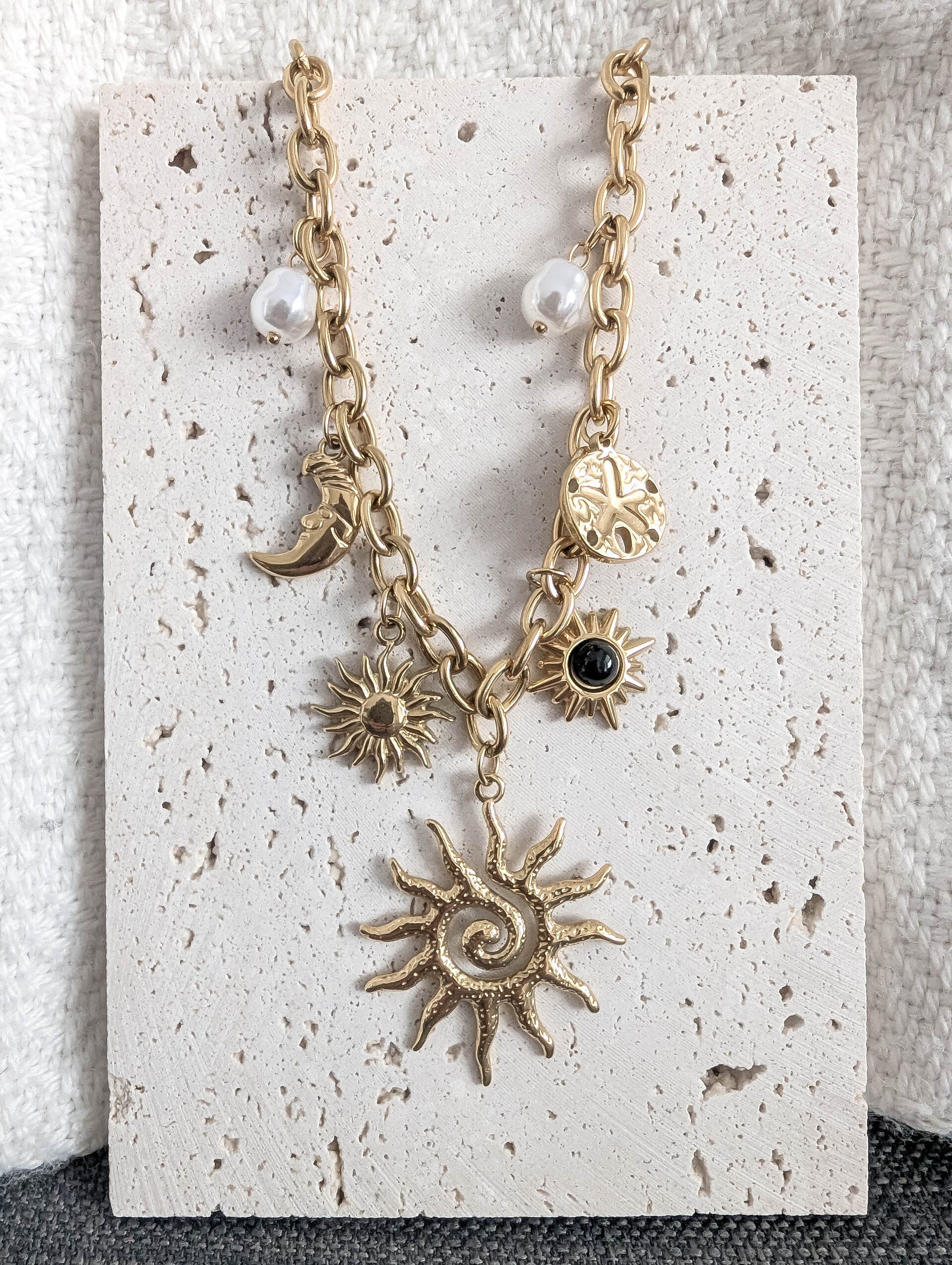 Laissez-vous séduire par le charme mystique du collier « Nova », une pièce éclatante inspirée des astres et de la beauté céleste. Ce bijou doré à maillons larges se distingue par ses pendentifs symboliques — un grand soleil spiralé, une lune délicate, des soleils miniatures et des perles lumineuses — évoquant l'harmonie entre le jour et la nuit.